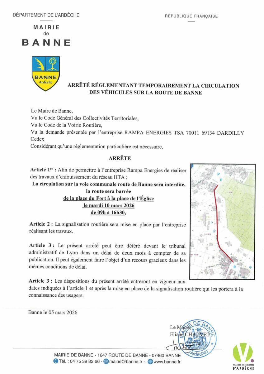 Arrêté De Circulation - Route De Banne 06/03/2026 La circulation sur la voie communale route de Banne sera interdite aux véhicules de toutes natures, la route sera barrée entre la place du Fort et de l'Église le Mardi 10 mars 2026 de 09h à 16h30.