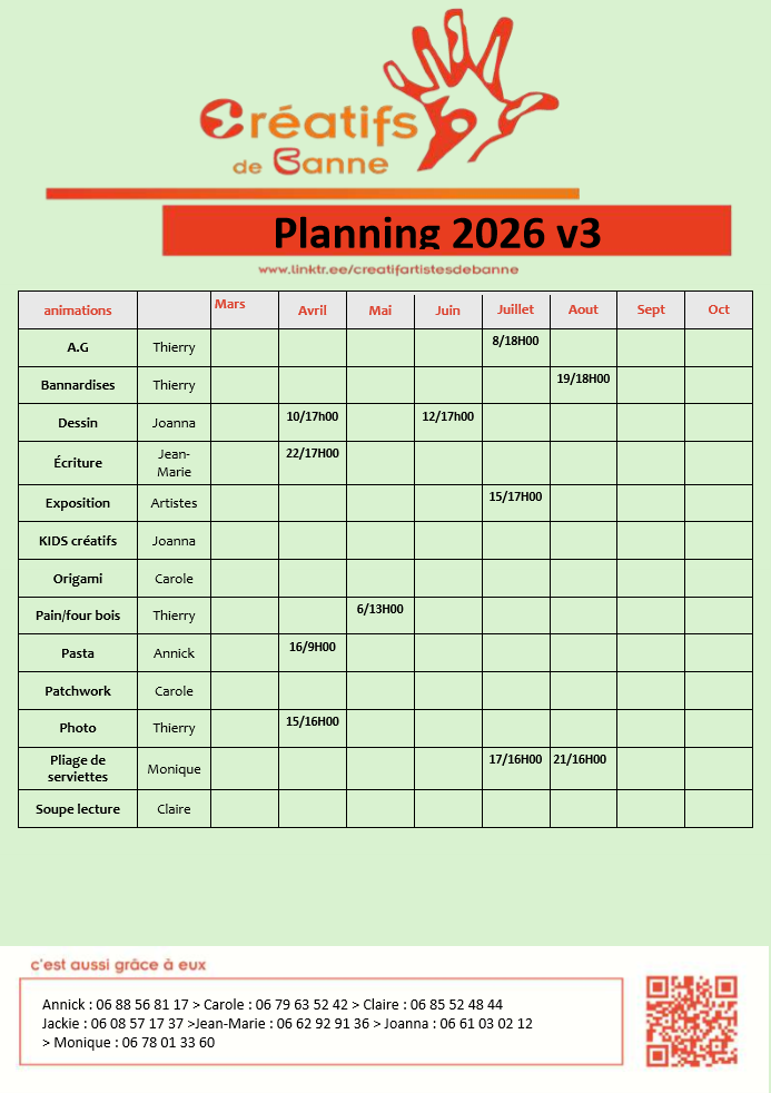 Planning Animations Des Créatifs De Banne 10/03/2026 📚🎨🖌Planning animations des Créatifs de Banne 📱🖼📚 Vous trouverez, en cliquant sur l'image, le planning des animations proposées par l'association Les Créatifs de Banne pour l'année 2026.