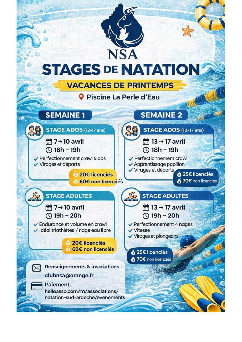 Pendant les vacances scolaire d'avril de notre zone, le Club de Natation Sud Ardèche propose