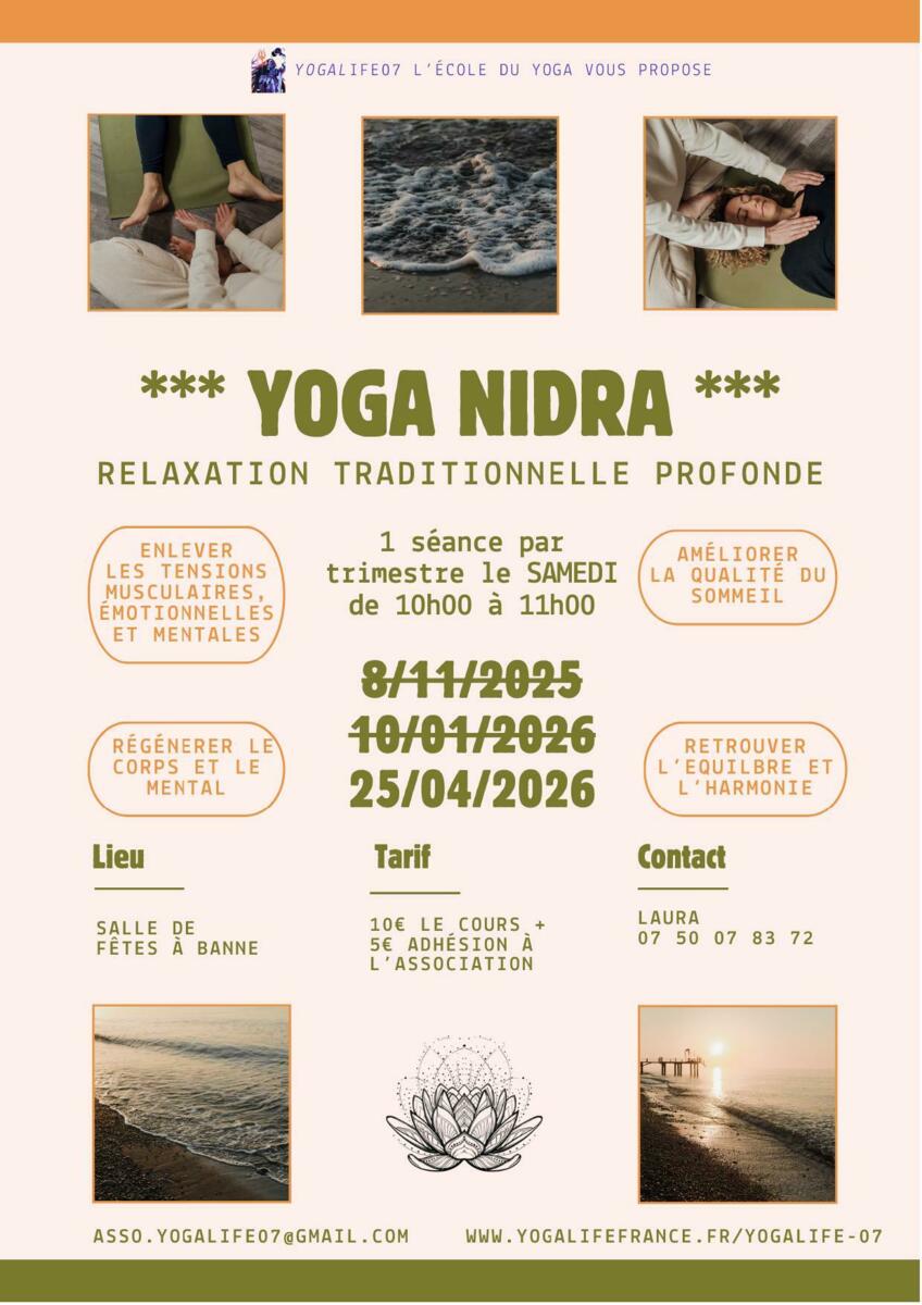 Yoga Nidra 24/03/2026 🧘♀️🧘 YOGA NIDRA 🧘♀️🧘♂️ L'association YogaLife07 vous propose une séance de yoga nidra - relaxation traditionnelle profonde - le Samedi 25 avril 2026 à la salle des fêtes de Banne. Toutes les infos en cliquant sur l'affiche !
