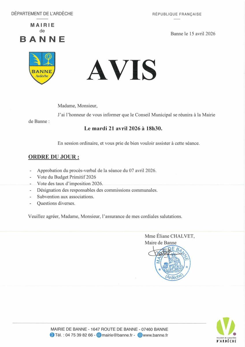 Réunion du Conseil Municipal Mardi 21 avril 2026 à 18h30