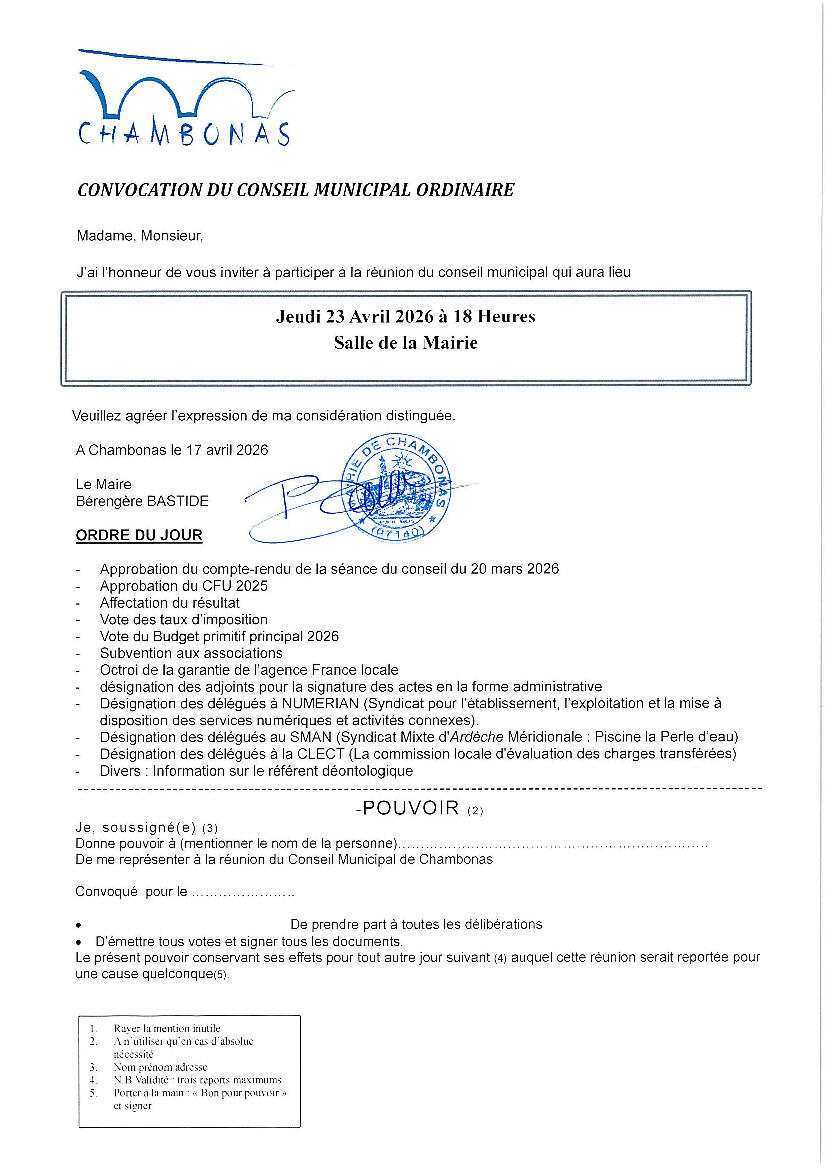 Conseil Municipal 16/04/2026 Le prochain conseil municipal se tiendra le jeudi 23 avril à 18h à la salle de la mairie. Source : Mairie de Chambonas