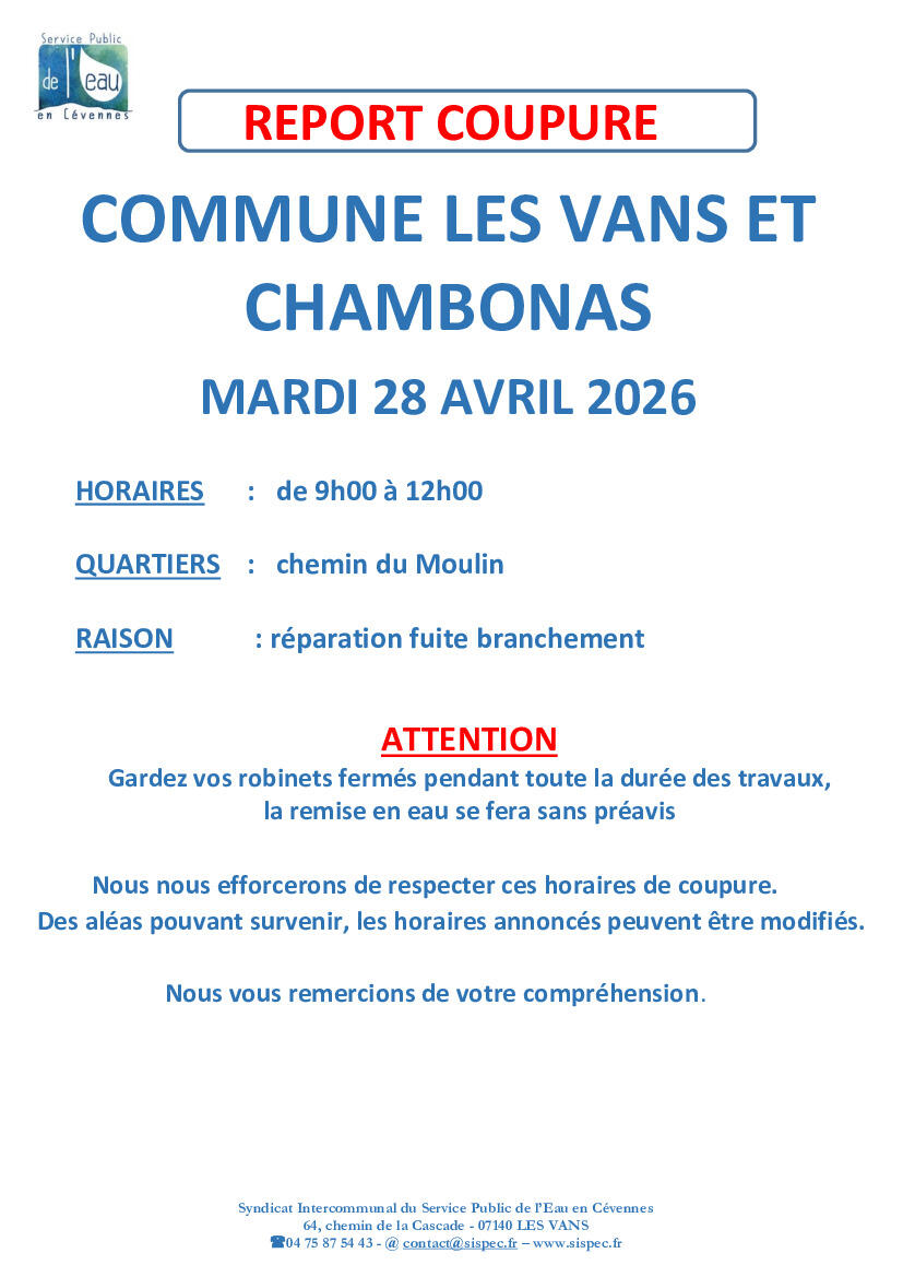 Coupure D'eau - Chemin Du Moulin 28/04/2026 Afin de réparer une fuite sur un branchement, l'eau sera coupée ce jour de 9h à 12h "chemin du Moulin". Merci de votre compréhension.