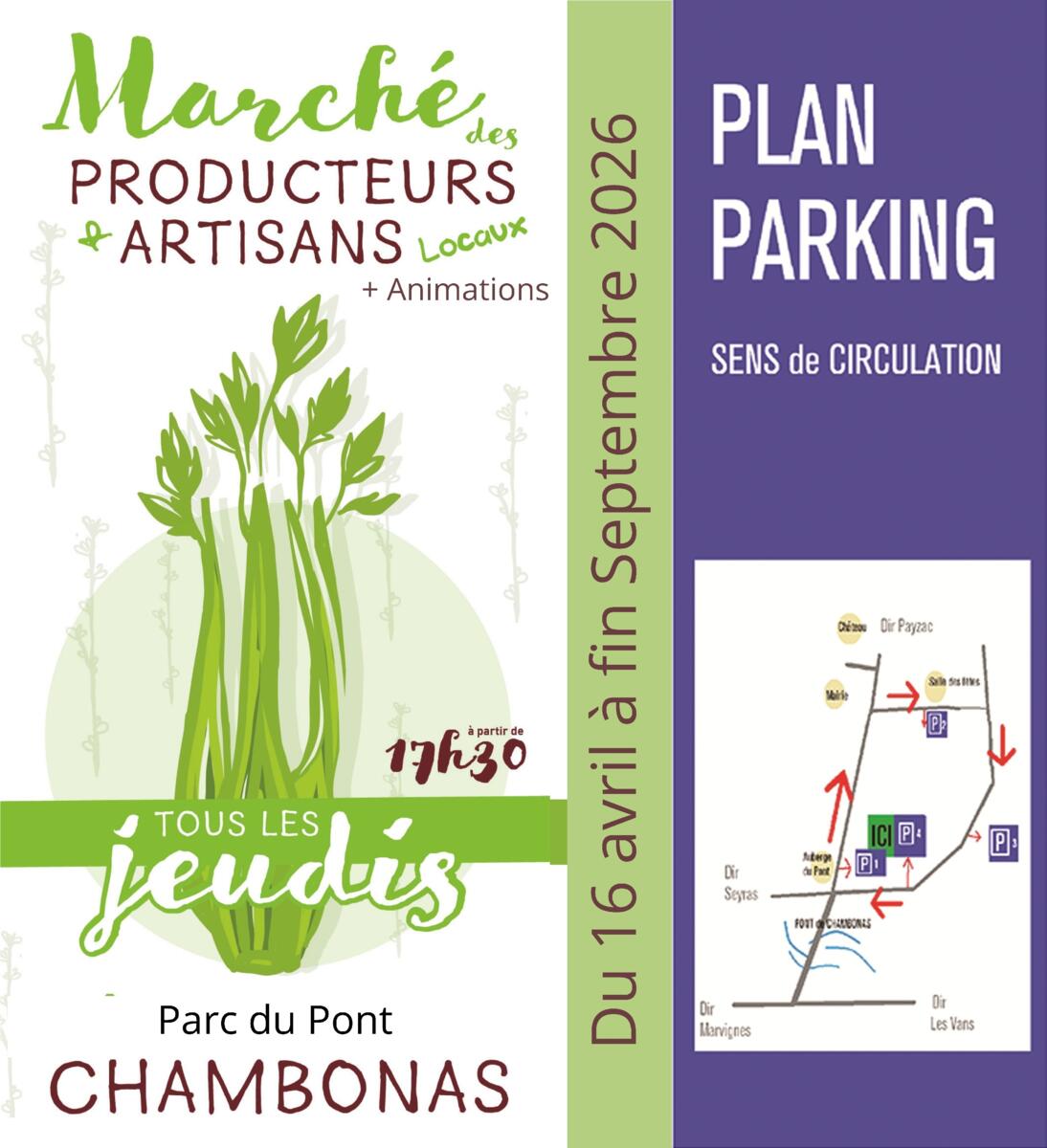 P'tit Marché À Chambonas 23/04/2026 Retrouvez le P'tit Marché de Chambonas à la place du Pont tous les jeudis à partir de 17h30. Merci de garer votre voiture aux parkings indiqués sur l'affiche.