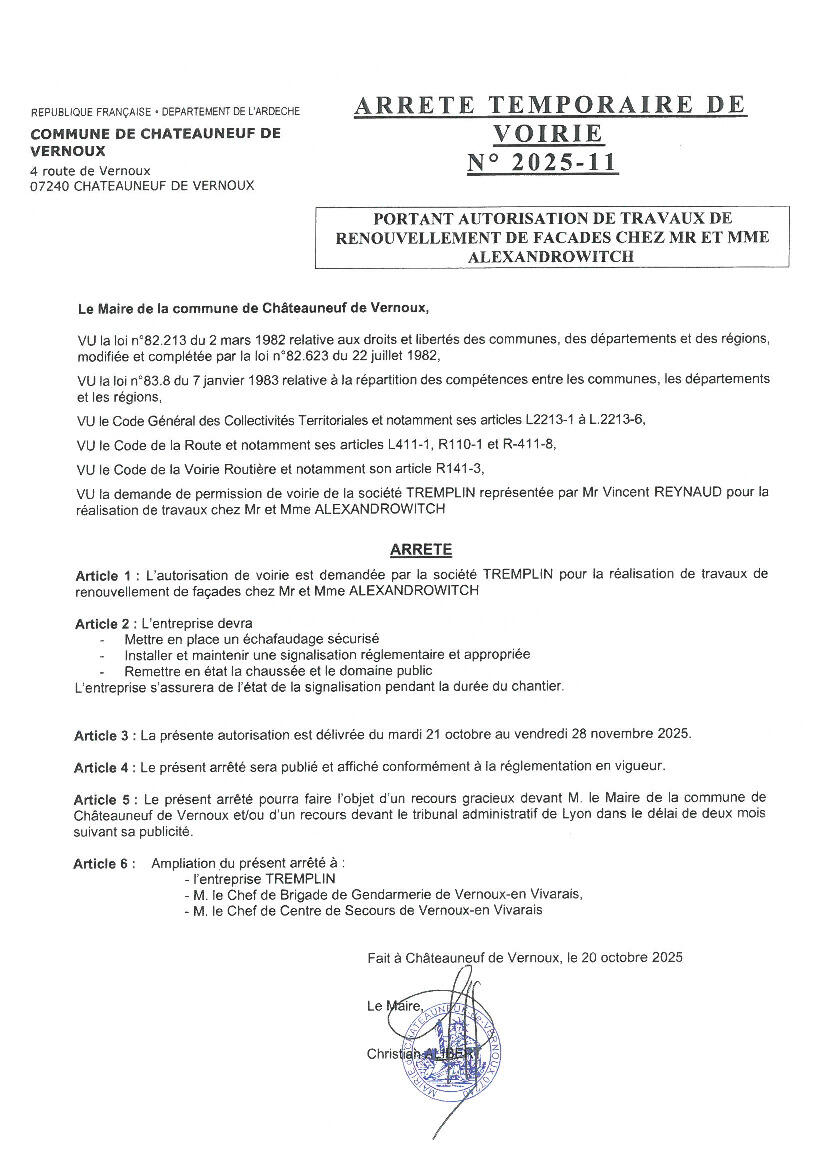 ARRETE TEMPORAIRE PORTANT AUTORISATION TRAVAUX DE VOIRIE