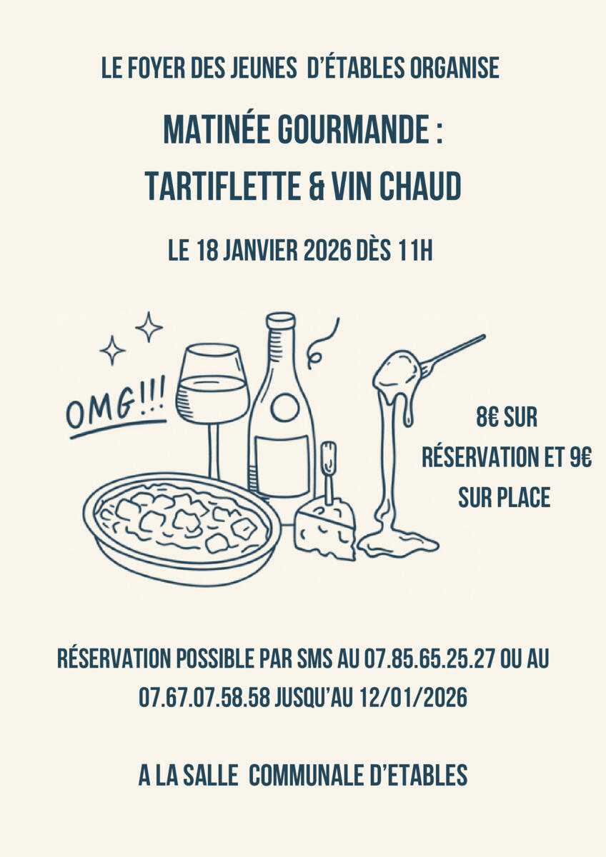 Matinée Tartiflette 😋😋😋- Foyer Des Jeunes 13/01/2026 Le dimanche 18 janvier à 11h00 Salle communale d’Etables On vous attend nombreux !!😋 🧀 😋