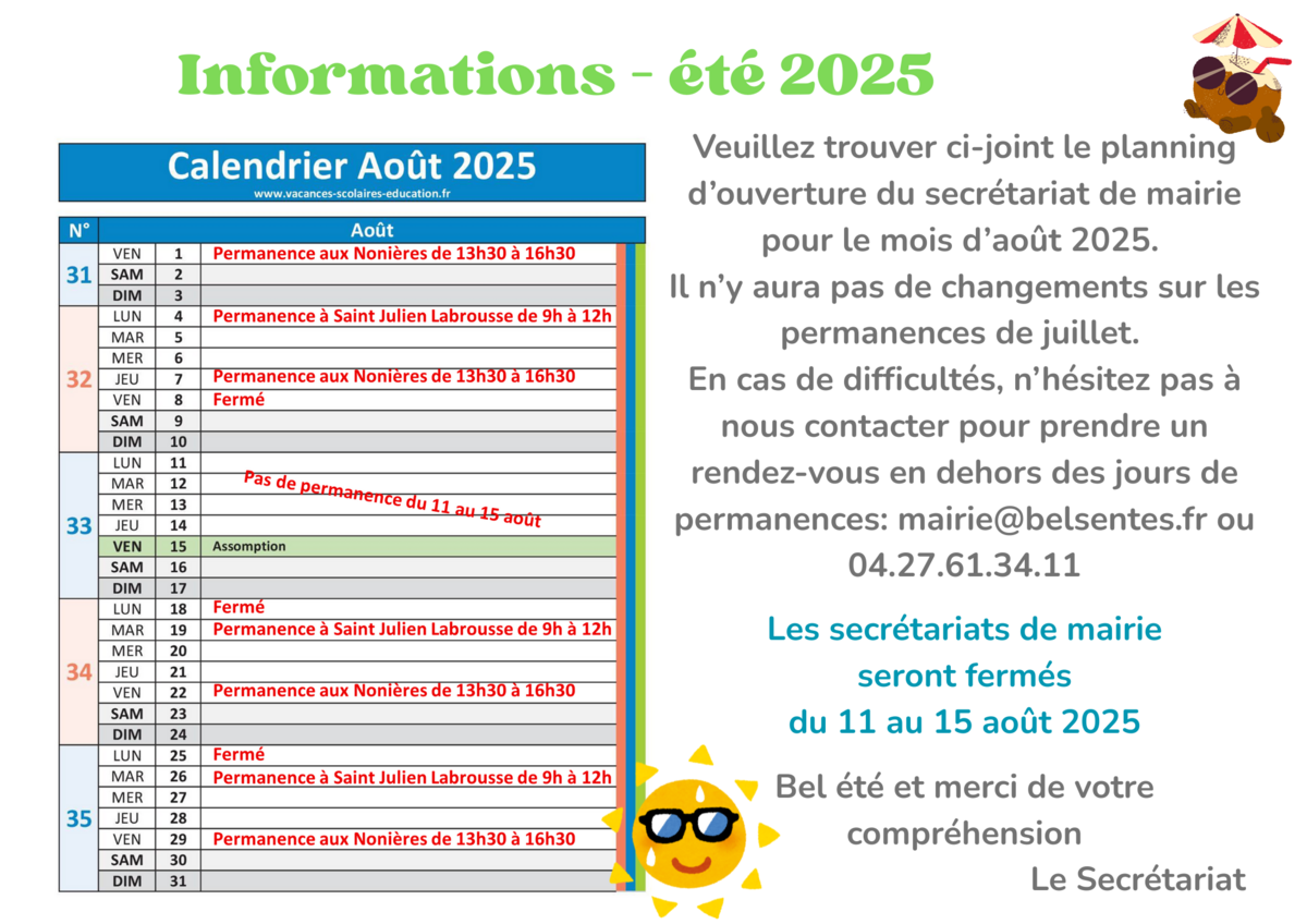 Vous trouverez ci joint une information concernant l'ouverture des secrétariats en août 2025.