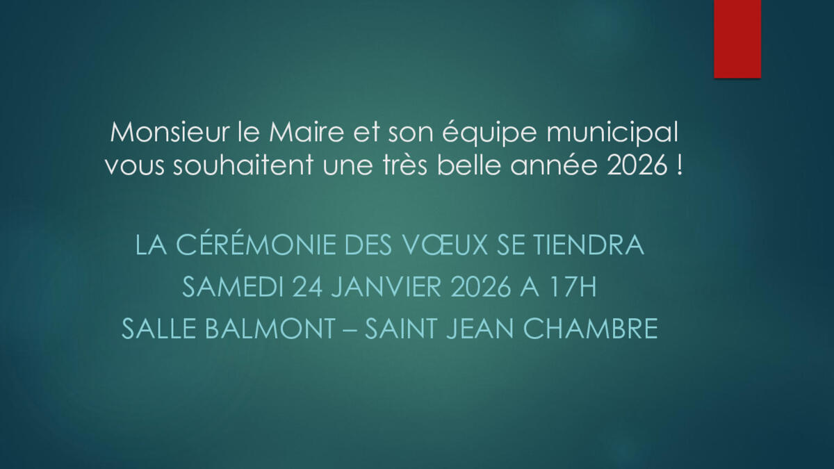 Cérémonie des voeux 07/01/2026 Madame, Monsieur, Monsieur le Maire de Saint Jean Chambre et son équipe municipale ont le plaisir de vous inviter à la cérémonie des vœux qui se tiendra le samedi 24 janvier 2026 à 17h, Salle Balmont de Saint Jean Chambre.