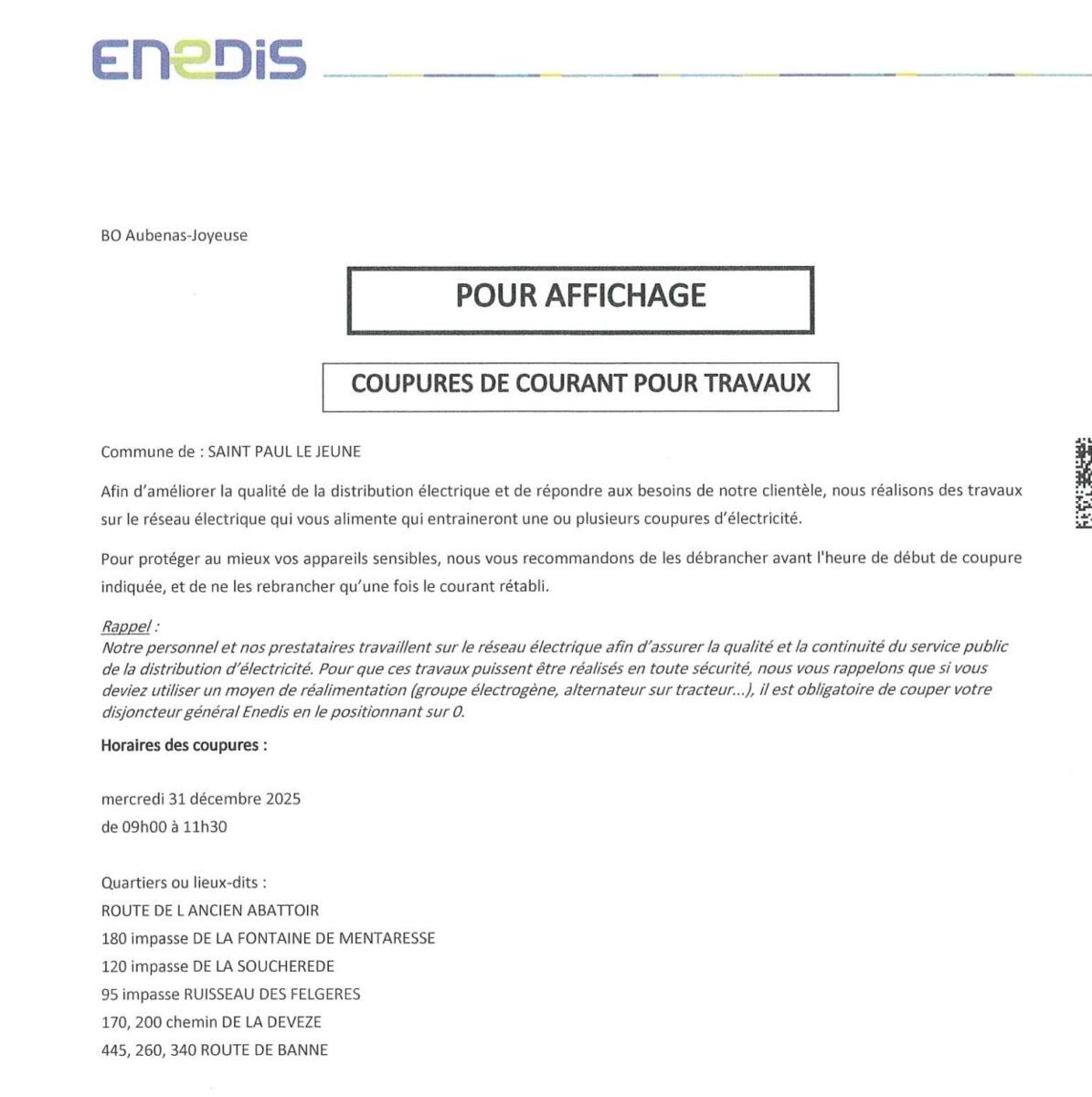 Avis coupure électricité Saint Paul le Jeune