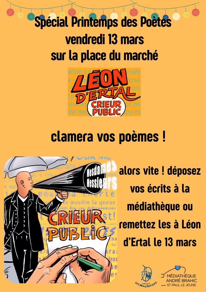 Glissez vos créations dans le « coffret des poètes » à l'accueil de la médiathèque et elles seront clamées jour de marché le vendredi 13 mars sur la place du village, par Léon d’Ertal « Crieur de rue professionnel »