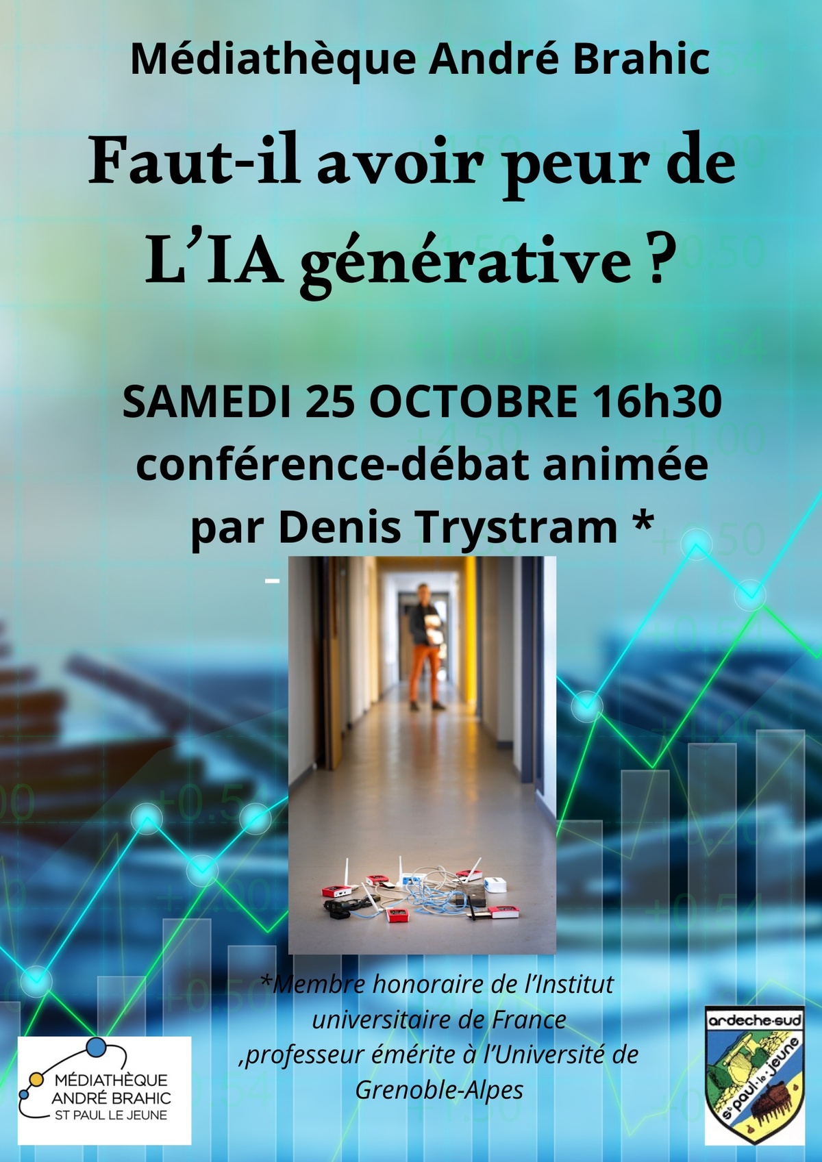 SAMEDI 25 OCTOBRE 16H30 à la médiathèque : "FAUT-IL AVOIR PEUR DE L'IA GENERATIVE" conférence-débat animée par Denis Trystram, professeur émérite à l'Université de Grenoble-Alpes et membre honoraire de l'Institut universitaire de France.