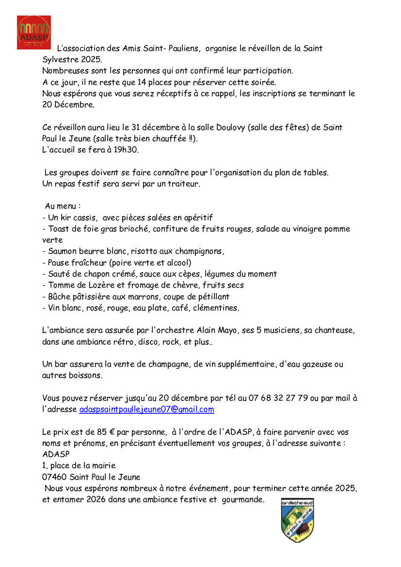 L'ADASP organise le réveillon de la Saint Sylvestre 2025.