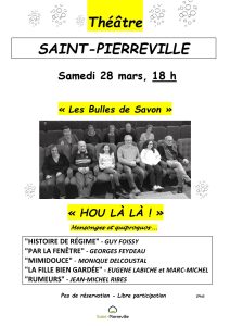 La troupe de théâtre cheylaroise « Bulles de savon », en partenariat avec la commune de SAINT-PIERREVILLE, est heureuse de proposer sa nouvelle programmation :