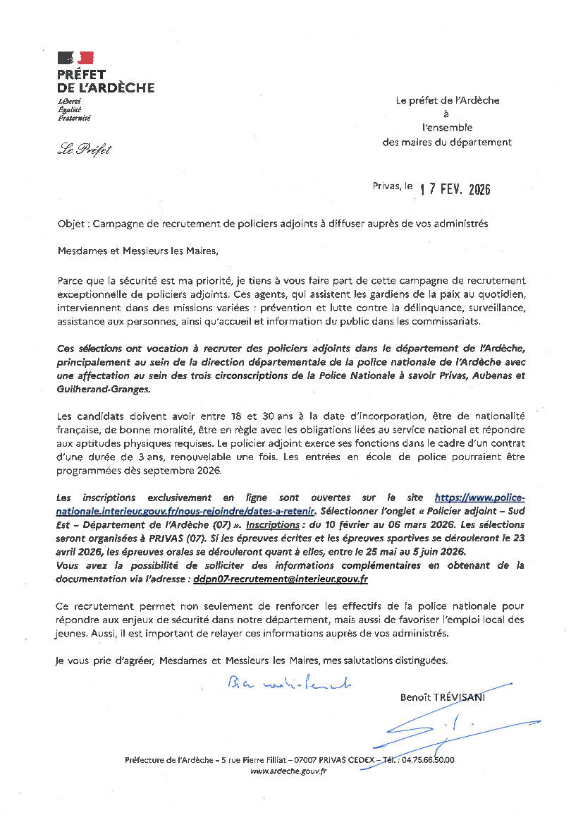 Les inscriptions exclusivement en ligne sont ouvertes du 10 février au 06 mars 2026, sur le site https://www.police-nationale.interieur.gouv.fr/nous-rejoindre/dates-a-retenir sélectionner l'onglet "Policier adjoint - Sud Est - Département de l'Ardèche (07)"