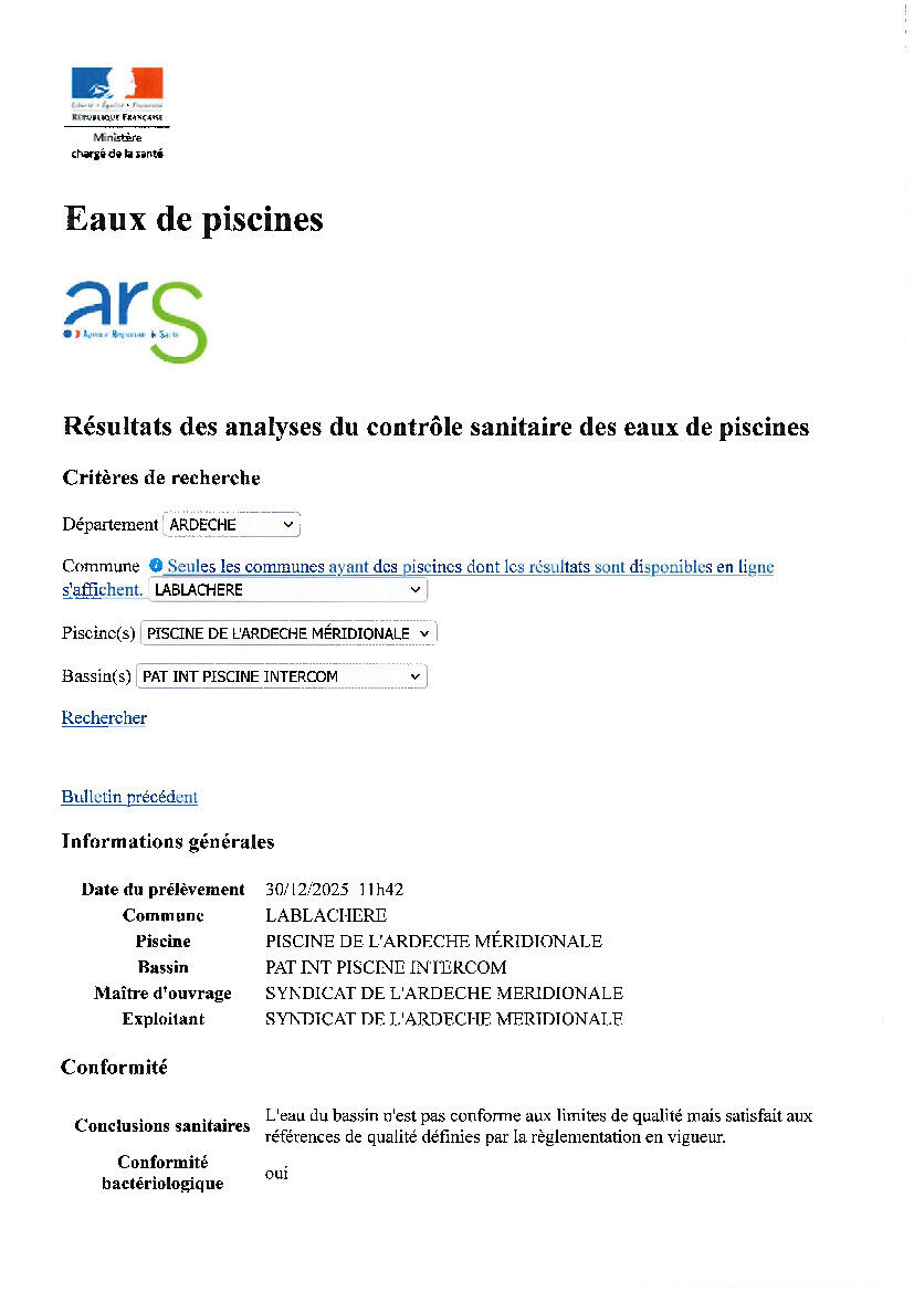 Résultats du contrôle sanitaire des eaux – Piscine La Perle