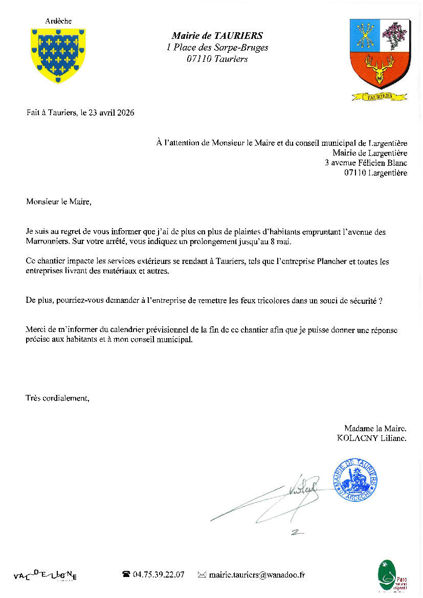 Nous vous informons que Madame la Maire a adressé ce jour un courrier à Monsieur le Maire et au conseil municipal de Largentière au sujet de la poursuite des travaux sur l’avenue des Marronniers.