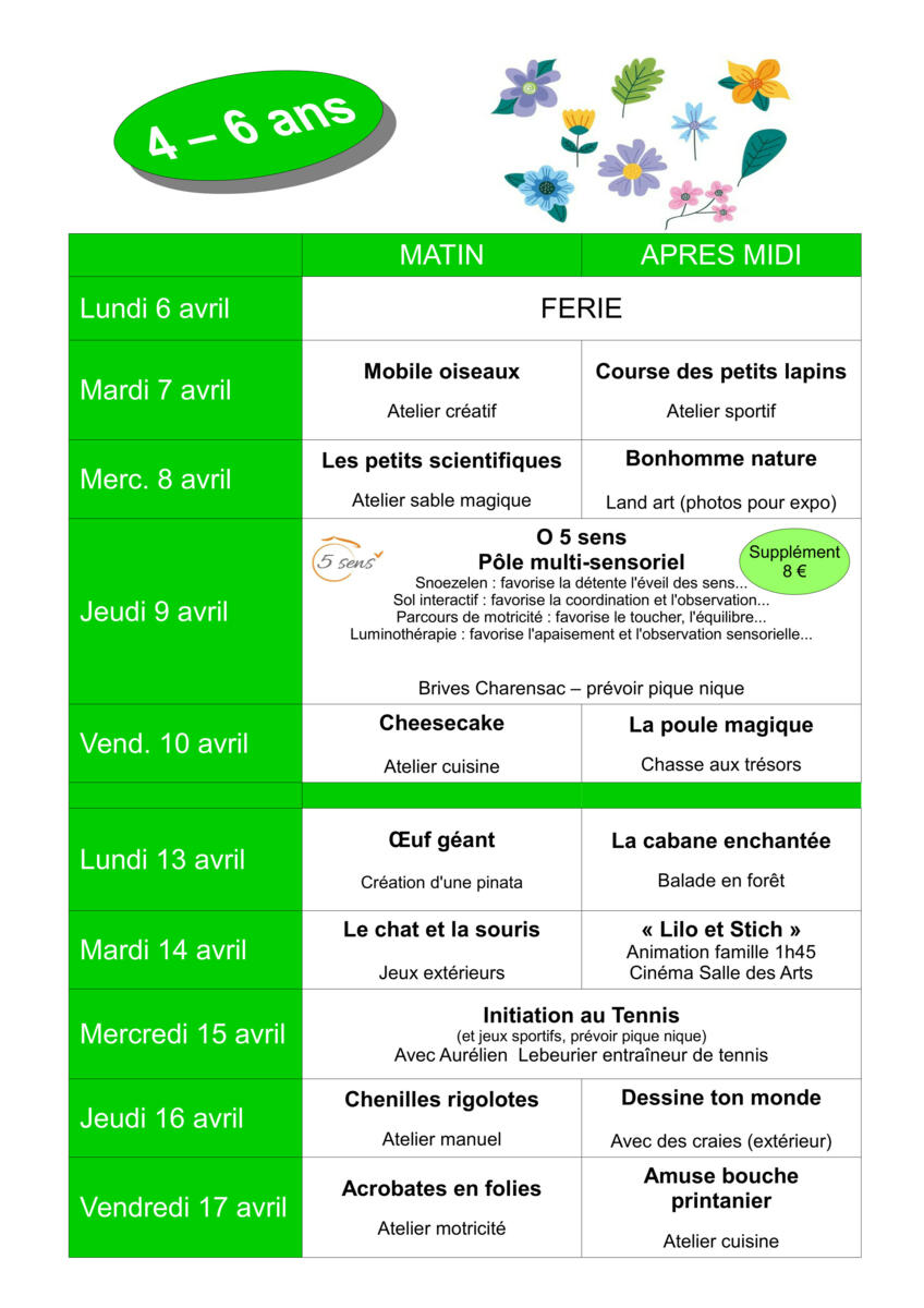 Programme de "l'accueil de loisirs" Vacances d'avril