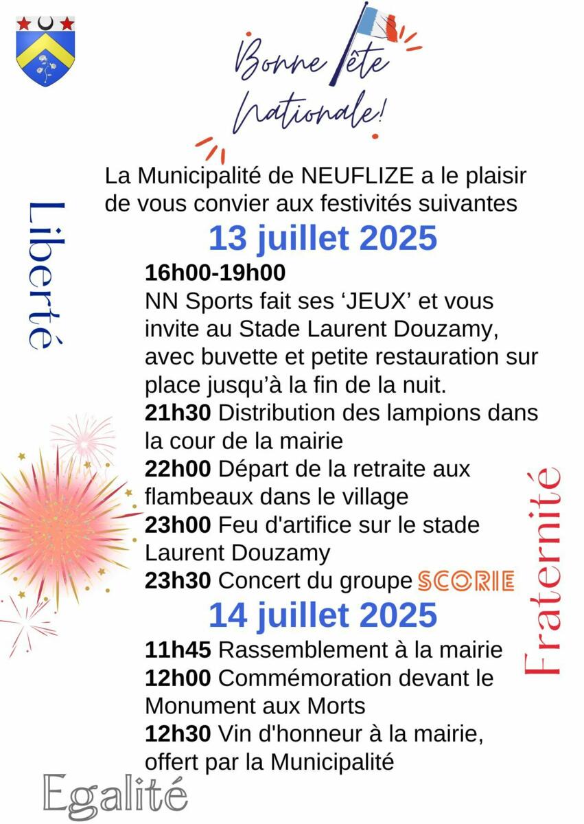La Municipalité de NEUFLIZE a le plaisir de vous convier aux festivités détaillées dans le programme ci-joint.