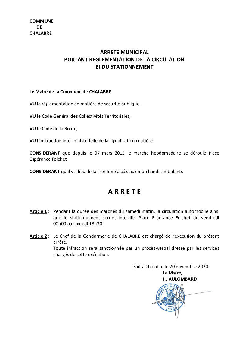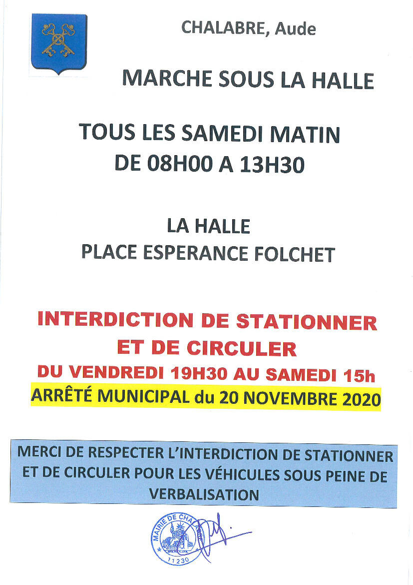 Afin de facilité l'accès et le travail des marchands ambulants lors du marché hebdomadaire, nous vous rappelons qu'il est interdit de stationner et de circuler Place Espérance Folchet du vendredi 19h00 au samedi 15H.