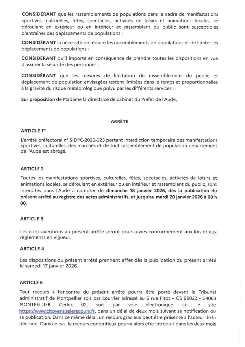 En raison des conditions météorologiques, les manifestations sportives, culturelles, fêtes, spectacles, activités de loisirs et animations locales, qu’elles se déroulent en extérieur ou en intérieur et accueillant du public, sont temporairement interdites dans le département de l’Aude.