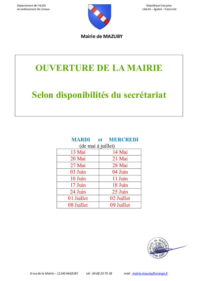 Selon les disponibilités du secrétarait, de mi-Mai à mi-Juillet, la Mairie sera ouverte les Mardi et Mercredi aux horaires habituels 9h00 à 16h30