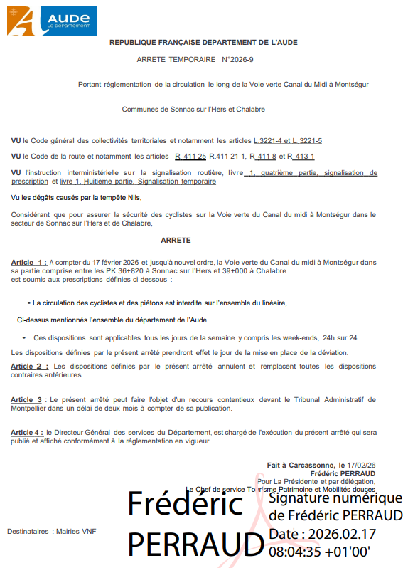 Arrêté d'interdiction de circuler Voie verte Sonnac Chalabre