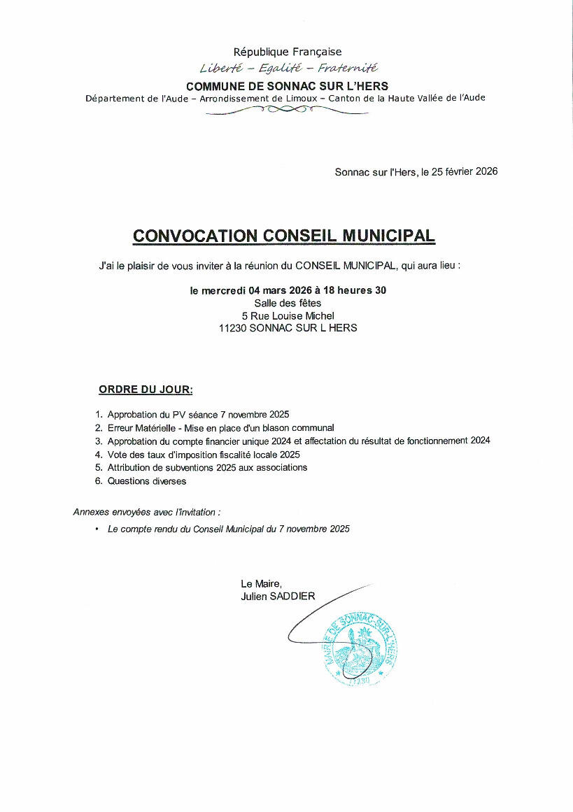 Le prochain Conseil Municipal est prévu le mercredi 4 mars 2026 à 18h30 à la salle des fêtes.