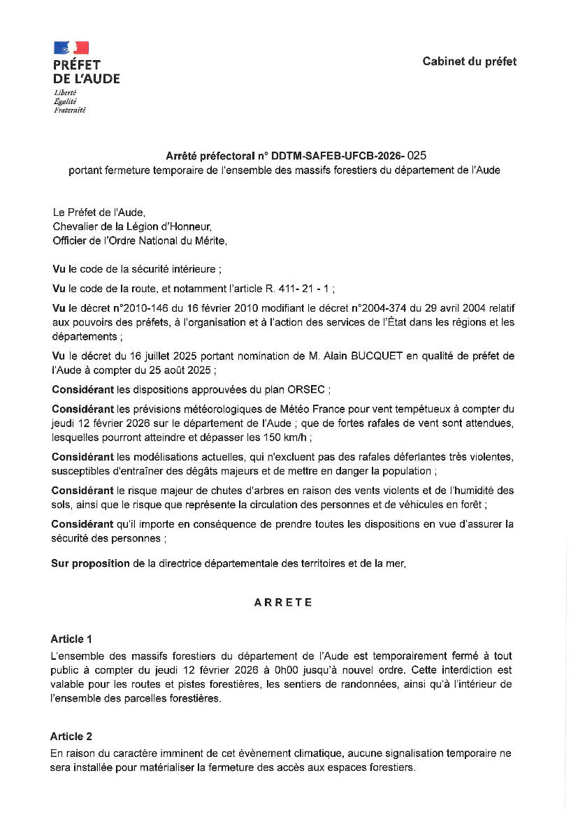 Fermeture de tous les massifs forestiers demain 12 février 11/02/2026 Voir arrêté du Préfet de l'Aude.