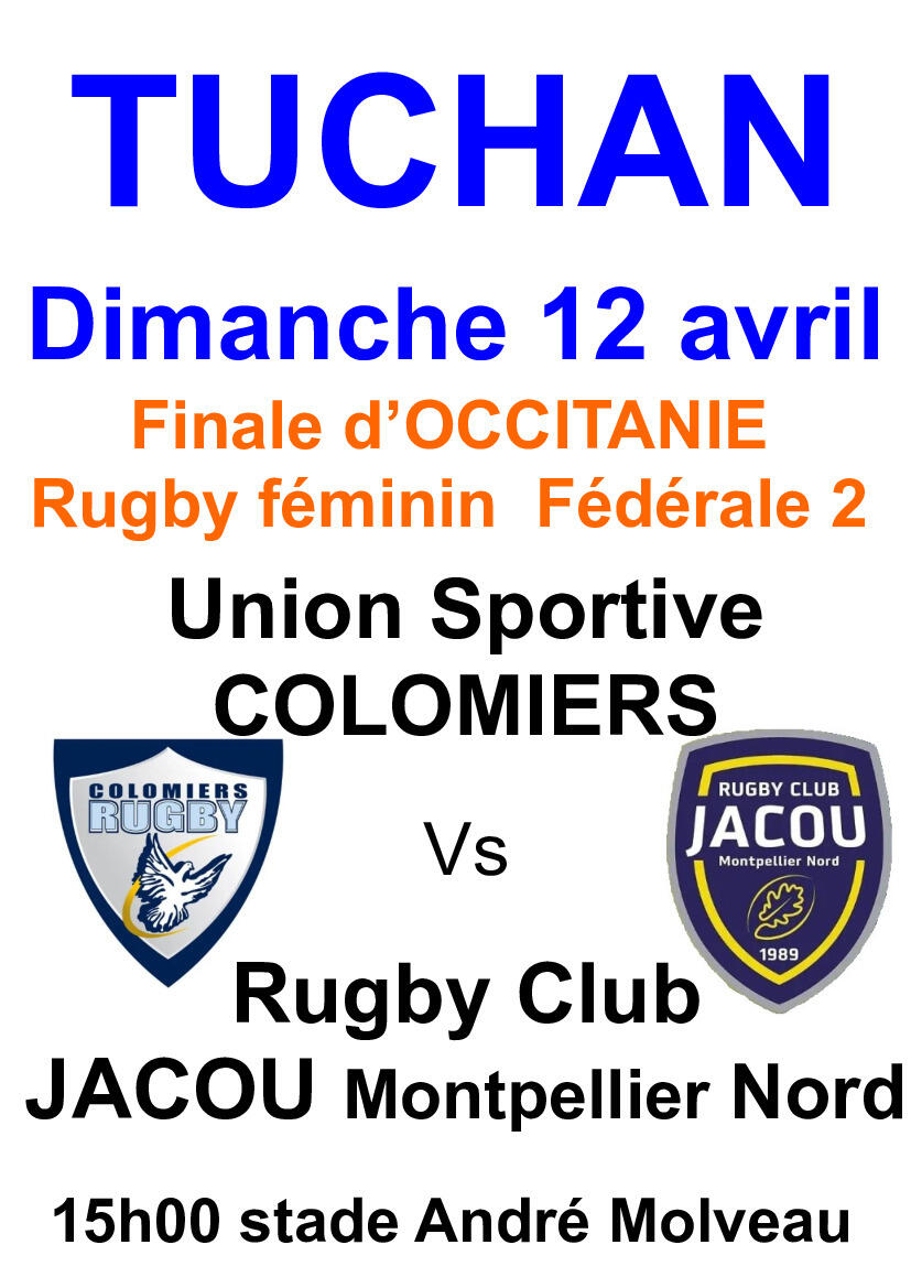 📢Le match final féminin UNION SPORTIVE COLOMIERS VS RUGBY CLUB JACOU se déroulera au stade André Molveau à 15h00, venez nombreux.📢