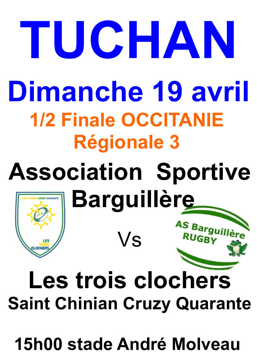 MATCH A 15H DIMANCHE 19 AVRIL AU STADE ANDRE MOLVEAU ASSOCIATION SPORTIVE BARGUILLERE VS LES TROIS CLOCHERS.