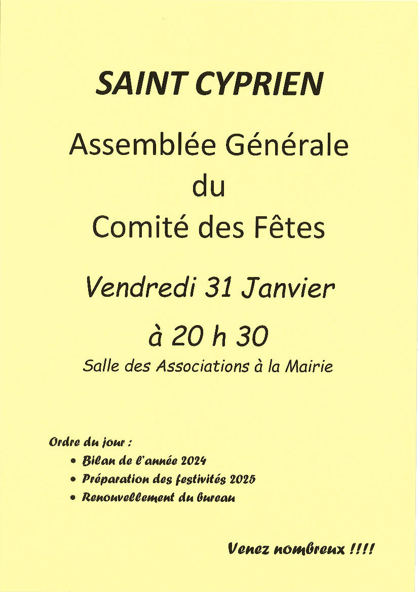 La prochaine AG du Comité des fêtes de Saint-Cyprien se déroulera le vendredi 31 Janvier à 20h30, salle des associations.