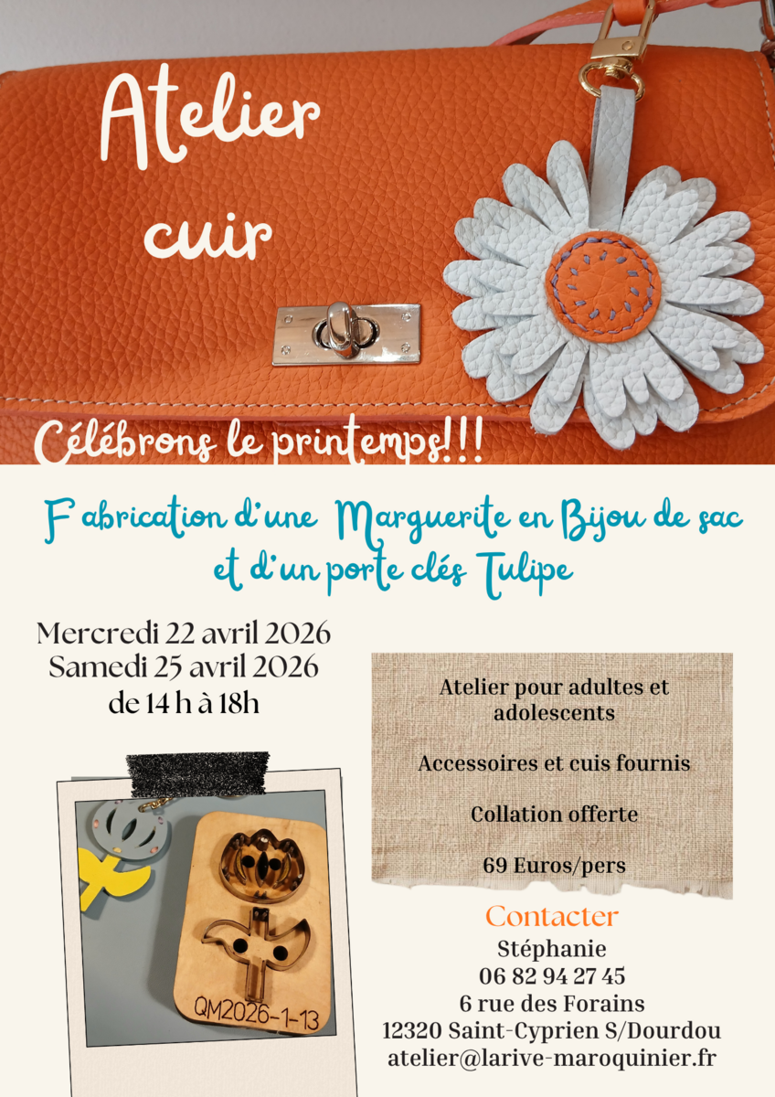L’atelier de Maroquinerie La Rive organise pour les vacances de Pâques un atelier « Fabrication d’une Marguerite en bijou de sac et d’un porte-clés en Tulipe. » pour adultes et adolescents.