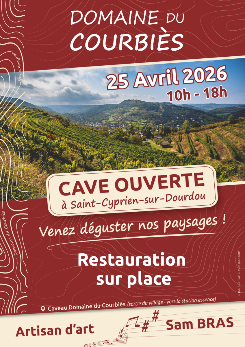 Le domaine du Courbiès, à Saint-Cyprien, est heureux de vous accueillir pour une journée "Cave ouverte" le 25 avril 2026 de 10h à 18h. Dégustation gratuite et vente sur place. Restauration sur place concocté par Mathilde de l'Ambass. Sam Bras assurera la partie musicale. Et des artisans d'art seront également présents. Venez déguster nos paysages !