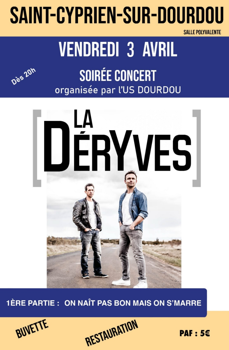 L'US Dourdou organise un concert avec le groupe La Déryves le vendredi 3 avril dés 20h00, salle polyvalente de Saint-Cyprien.