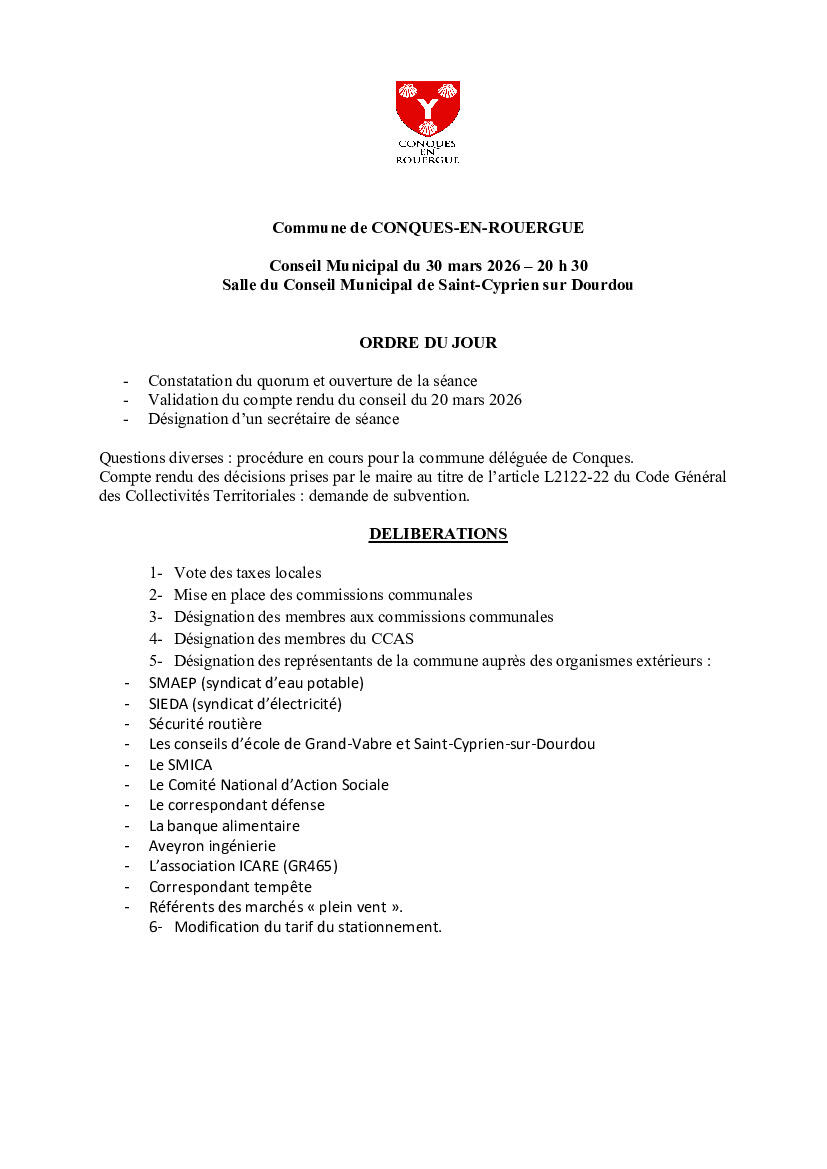 Veuillez trouver ci-joint l'ordre du jour du prochain Conseil municipal.