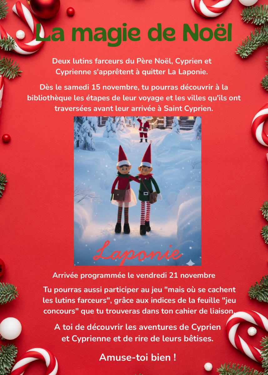 Le 15 Novembre et le  22 Décembre, la bibliothèque de Saint-Cyprien fait venir deux lutins farceurs du Père Noël à découvrir.
