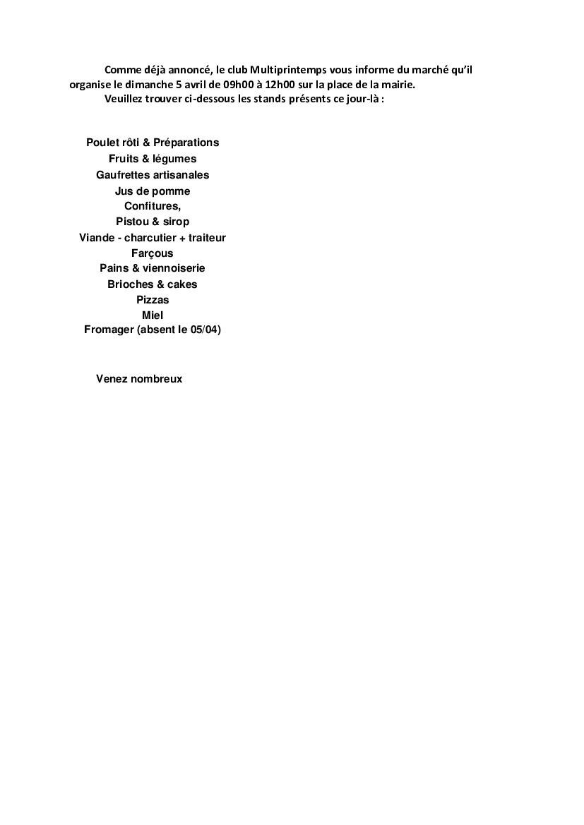 Le club Multiprintemps organise un marché les dimanches 5 Avril, 3 Mai et 7 Juin 2026, de 9h00 à 12h00.