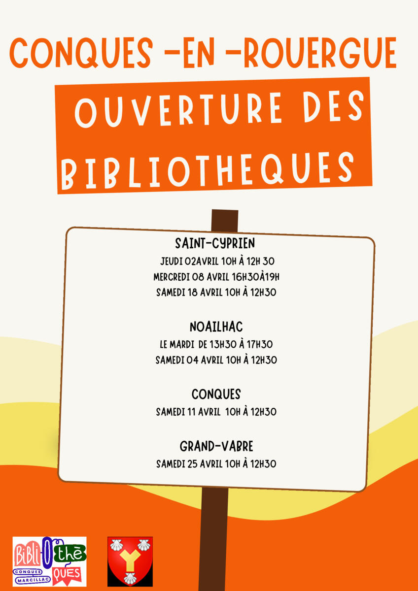 Veuillez trouver ci-joint les horaires d'ouverture des quatre bibliothèques du réseau de la commune de Conques-en-Rouergue pour le mois d'avril. Petit rappel : la bibliothèque de Grand-Vabre sera ouverte samedi 28 mars de 10h à 12h30. Bonne lecture !