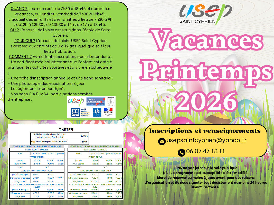 Veuillez trouver ci-joint le programme des vacances de printemps organisé par l'Usep de Saint-Cyprien, pour les enfants de 3 à 12 ans même pour ceux hors territoire.