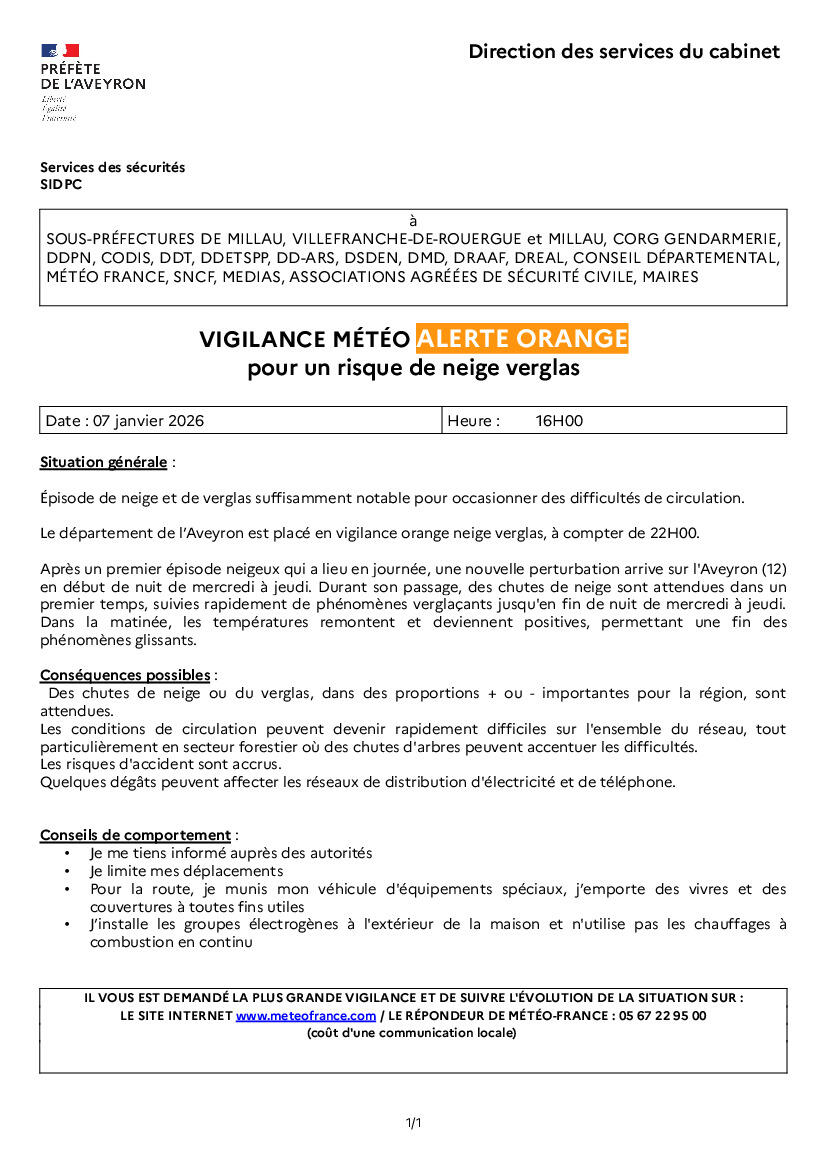 VIGILANCE ORANGE NEIGE - VERGLAS 07/01/2026 Soyez vigilants et prudents.... Source : Mairie de Sénergues