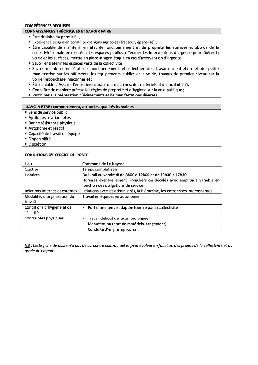 Nous recherchons un agent technique polyvalent en milieu rural dont vous trouverez la fiche de poste correspondante.