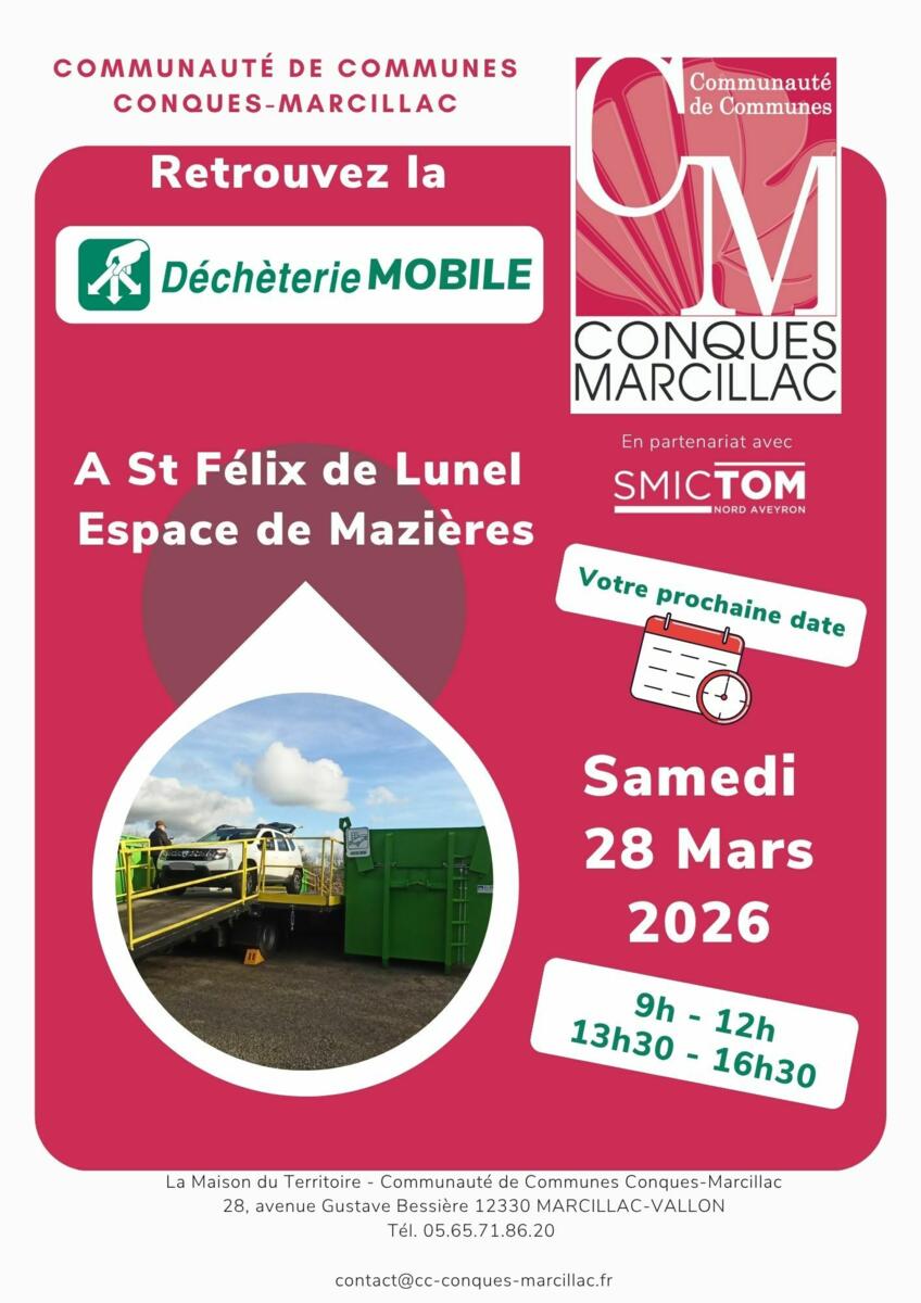 Déchèterie Mobile Samedi 28 Mars 2026 À Mazières - St Félix 27/03/2026 Nous vous informons que la prochaine déchèterie mobile aura lieu le samedi 28 mars 2026 à St Félix de Lunel, à Mazières.