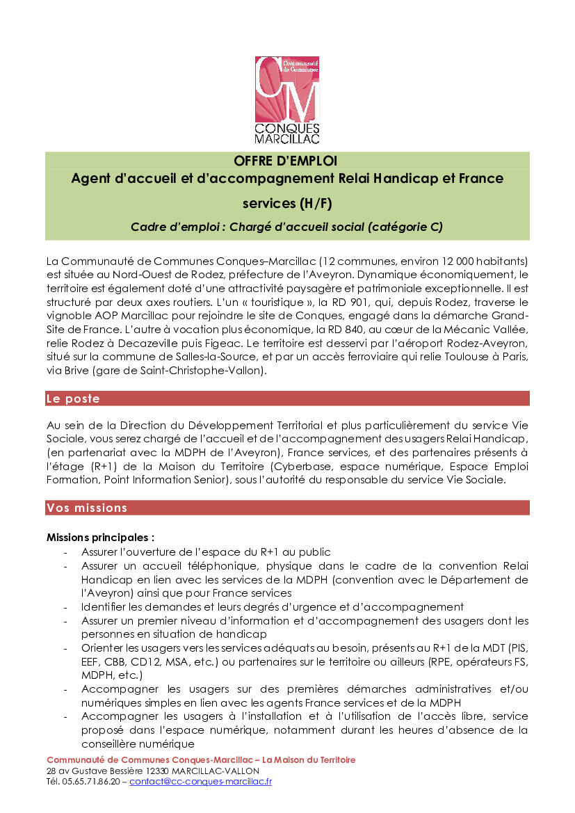 Veuillez trouver ci-joint une offre d'emploi proposée par la Communauté de Communes Conques-Marcillac.
