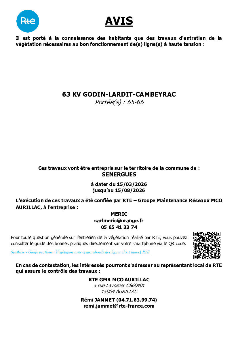 Nous avons l'honneur de vous informer que, conformément aux dispositions de l'article 12 de la Loi du 15 juin 1906 sur les distributions d'énergie et de l'arrêté du 17 mai 2001 relatif aux conditions techniques auxquelles doivent satisfaire les lignes de transport et de distribution électrique, des travaux d'élagage et d'abattage vont être entrepris prochainement sur le territoire de la commune de Sénergues, afin d'assurer le bon fonctionnement des lignes hautes tension mais également la sécurité des personnes aux abords de ces ouvrages.