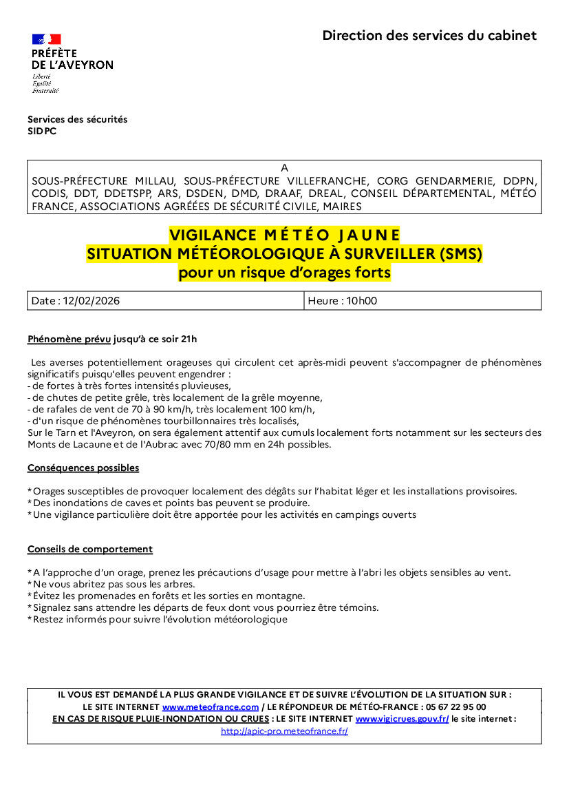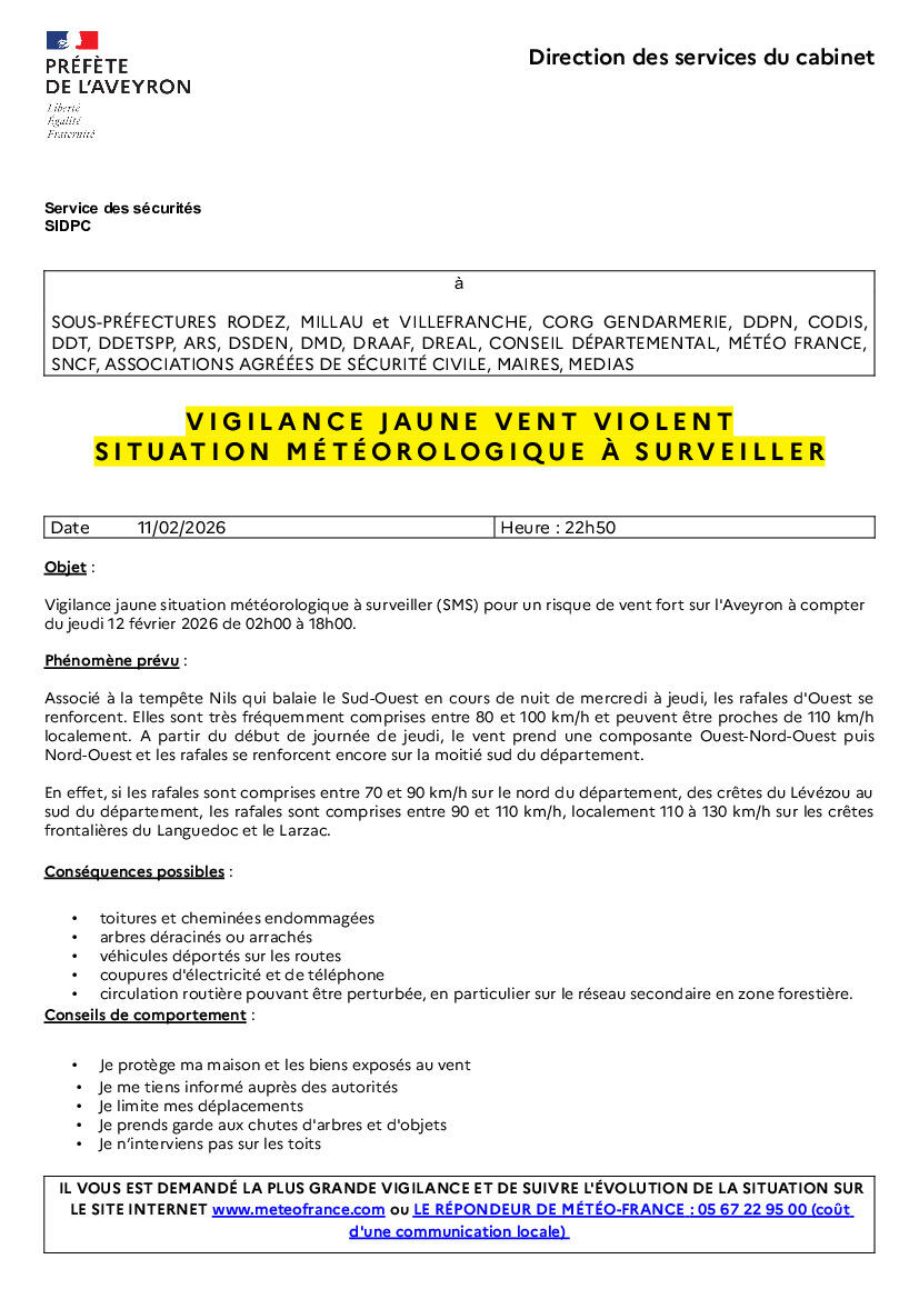 VIGILANCE Jaune Orages et Vents violents 12/02/2026 Soyez vigilants et prudents.... Source : Mairie de Sénergues