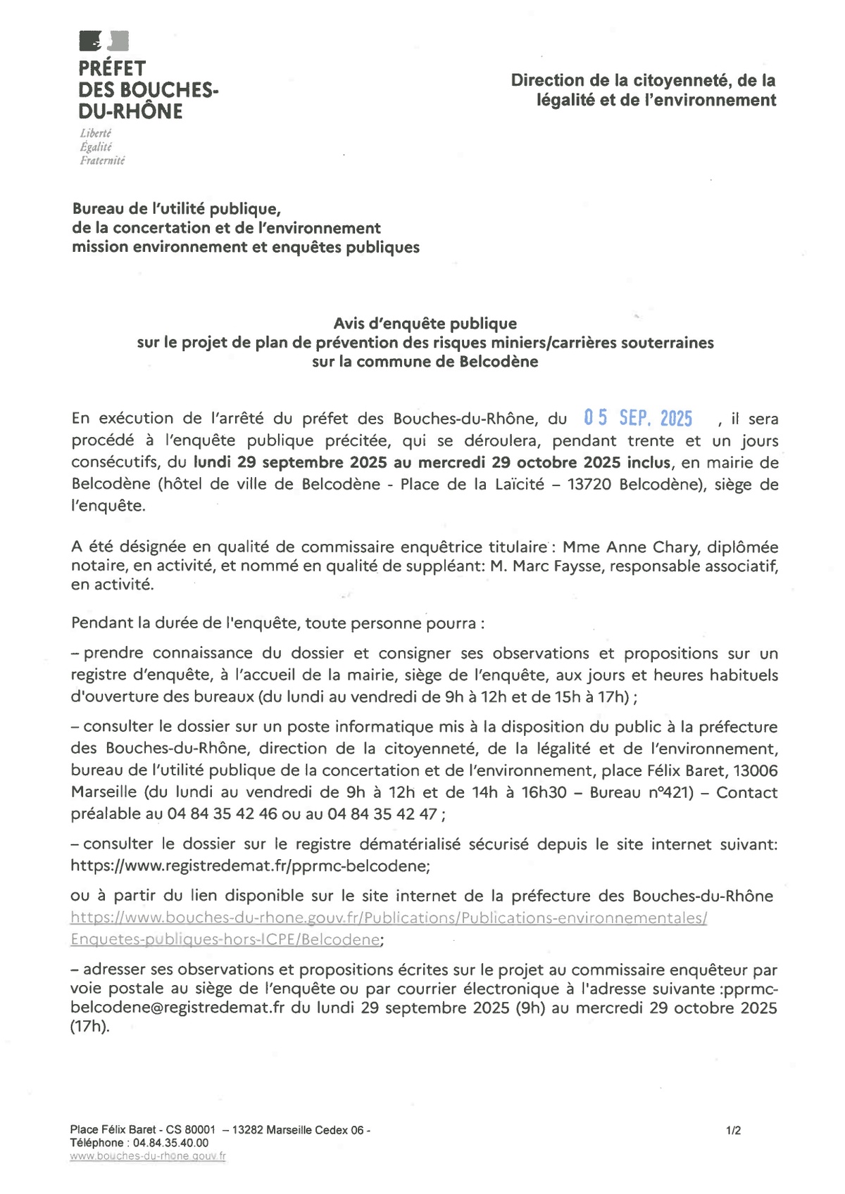 Les services de l'État, en collaboration avec la commune de Belcodène, lancent une enquête publique concernant le projet de Plan de Prévention des Risques Miniers et Carrières souterraines (PPRMC) lié aux anciens travaux miniers et carrières souterraines présents sur notre Commune.