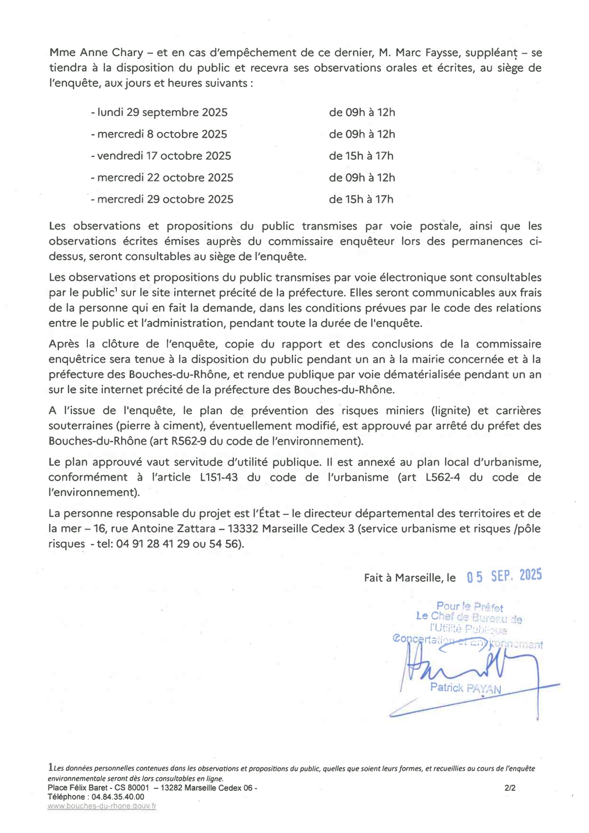 L'enquête publique se déroulera du 29 septembre au 29 octobre 2025 inclus. Vous aurez plusieurs moyens pour consulter le dossier et vous exprimer. Des permanences du commissaire enquêteur auront lieu en mairie aux dates suivantes :