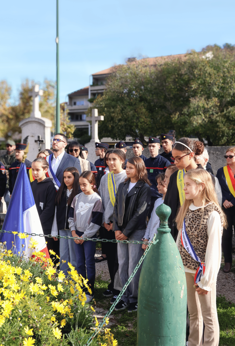 La commémoration a débuté par la lecture d’un texte par deux membres du Conseil Municipal des Jeunes, Julia et Rafaëlle USAI suivie d’une allocution de Monsieur le Maire. Elle s’est poursuivie par le dépôt de gerbes, avant de se conclure au monument aux morts du vieux cimetière.