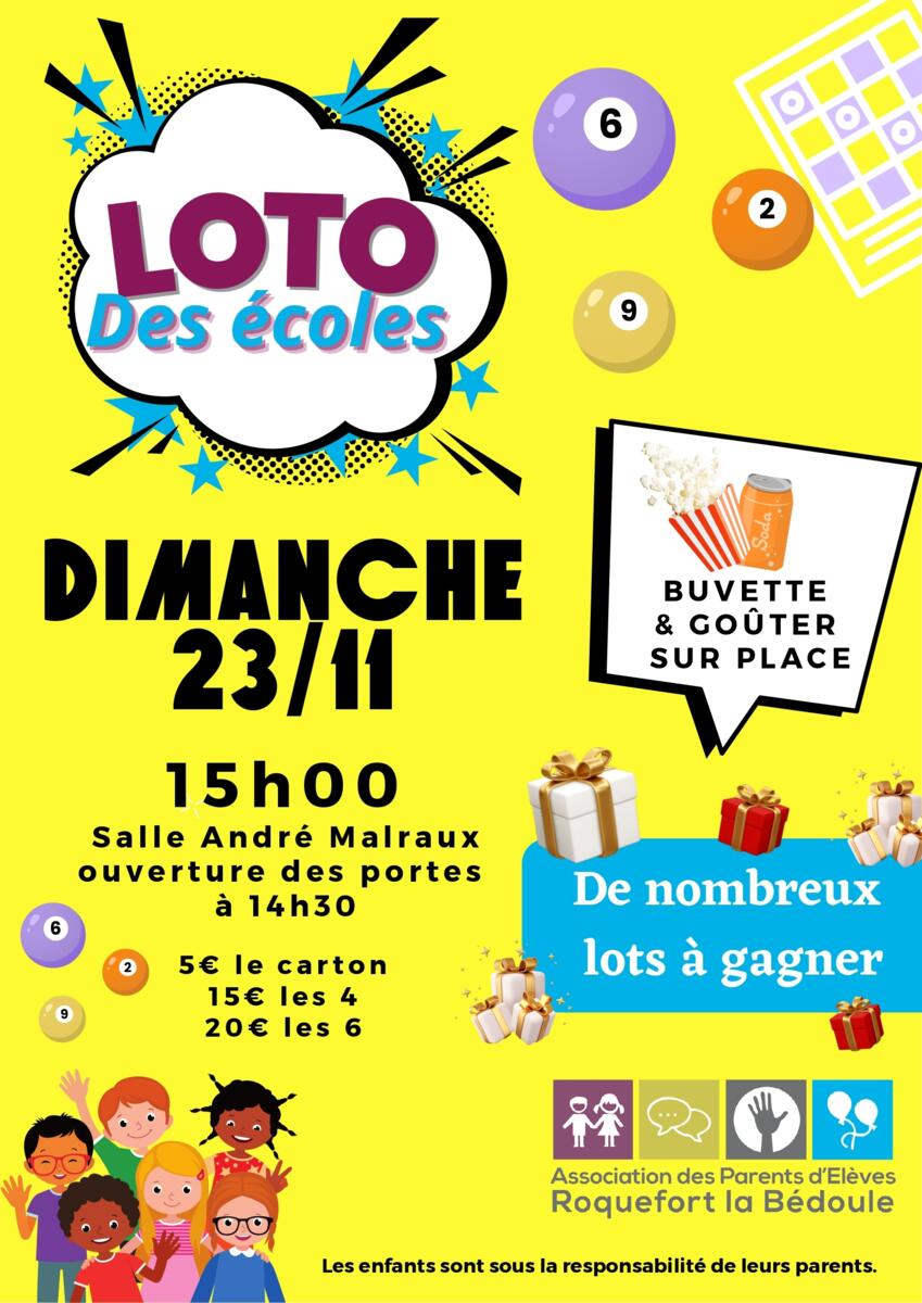 🎲 Loto de l'Association des Parents d'Elèves -Ouverture des portes à 14h30 au centre culturel André Malraux. Tarifs : 5€ le carton, 15€ les 4, 20€ les 6