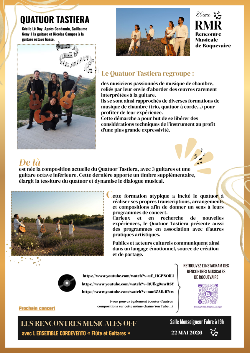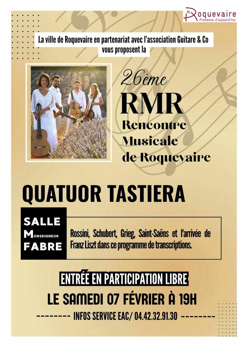 La Ville de Roquevaire, en partenariat avec Guitare & Co, vous invite à un concert du Quatuor Tasteria, composé de Cécile Lê Duy, Agnès Condamin, Guillaume Geny et Nicolas Campos.